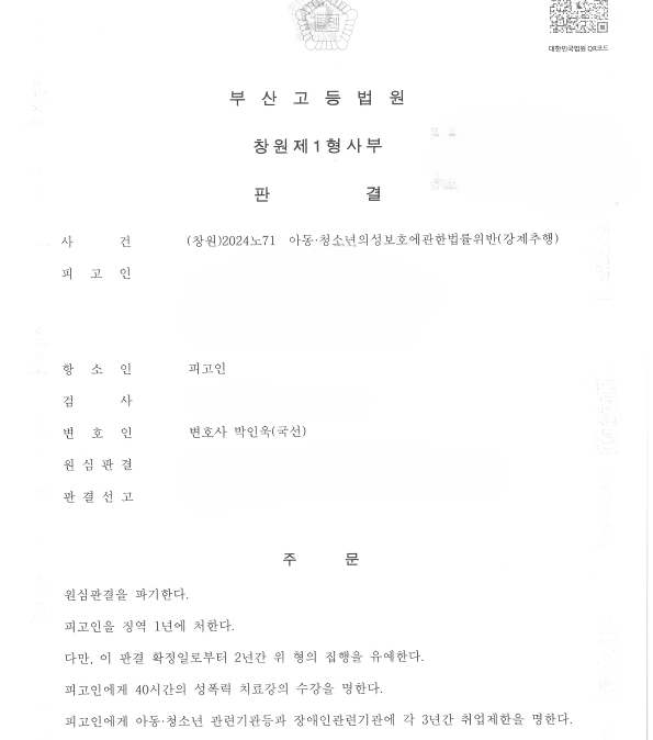 부산고등법원 창원재판부 2024노71 아동·청소년의성보호에관한법률위반(강제추행)