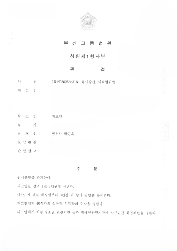 부산고등법원 창원재판부 2025노318 유사강간, 의료법위반)