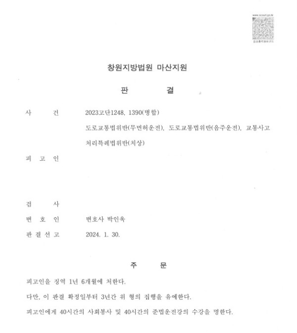 창원지방법원 마산지원 2023고단1248, 1390(병합) 도로교통법위반(무면허운전), 도로교통법위반(음주운전), 교통사고처리특례법위반(치상)