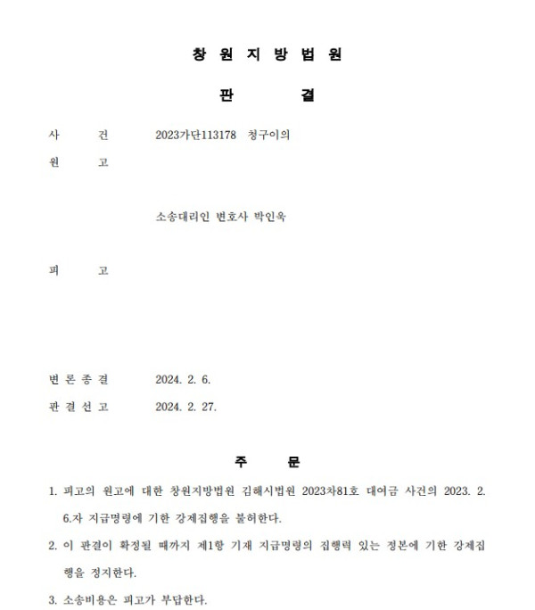 지급명령에 기한 강제집행은 불허한다는 판결이 선고되었습니다(원고 승소).