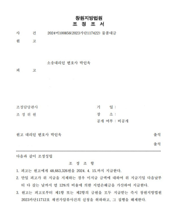 원고가 주장하는 대금의 대부분을 피고가 수용하는 내용으로 조정이 성립되었습니다.