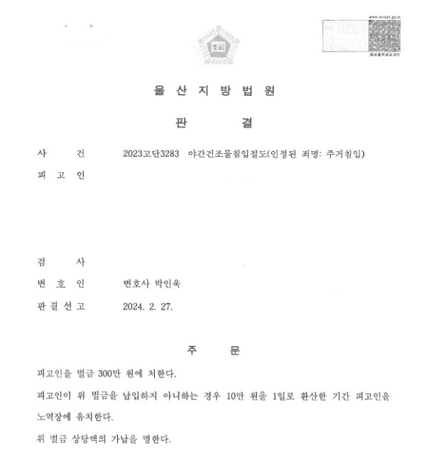 울산지방법원 2023고단3283 야간주거침입절도(인정된 죄명 : 주거침입)