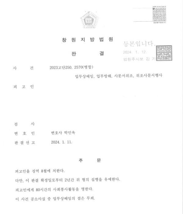 창원지방법원 2023고단250,2570(병합) 업무상배임, 업무방해, 사문서위조, 위조사문서행사