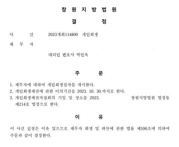 3. 개시결정 후 원금의 30%인 24,086,808원을 변제하는 회생절차 개시결정