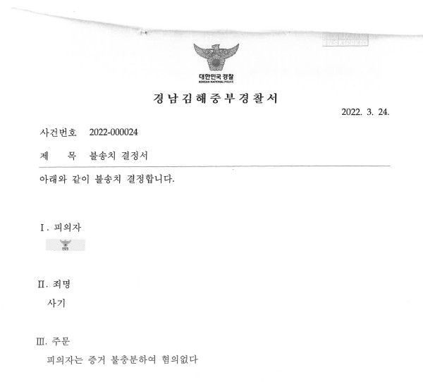 그 결과 피의자에 대한 혐의없다는 이유로 불송치결정되었습니다.