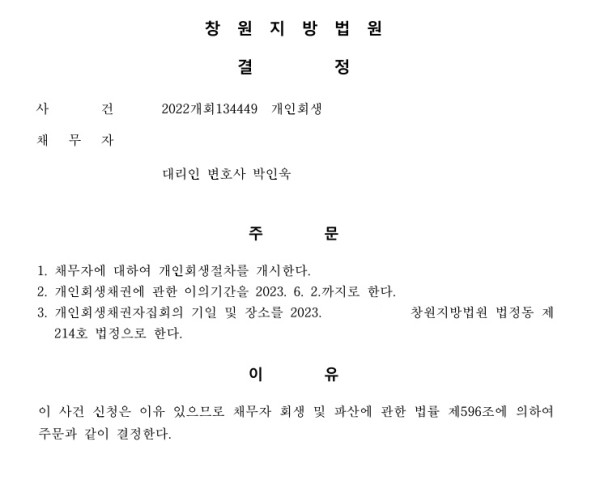 3. 개시결정 후 원금의 16%인 23,728,914원을 변제하는 회생절차 개시결정!!