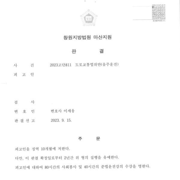 창원지방법원 마산지원 2023고단811 도로교통법위반(음주운전)