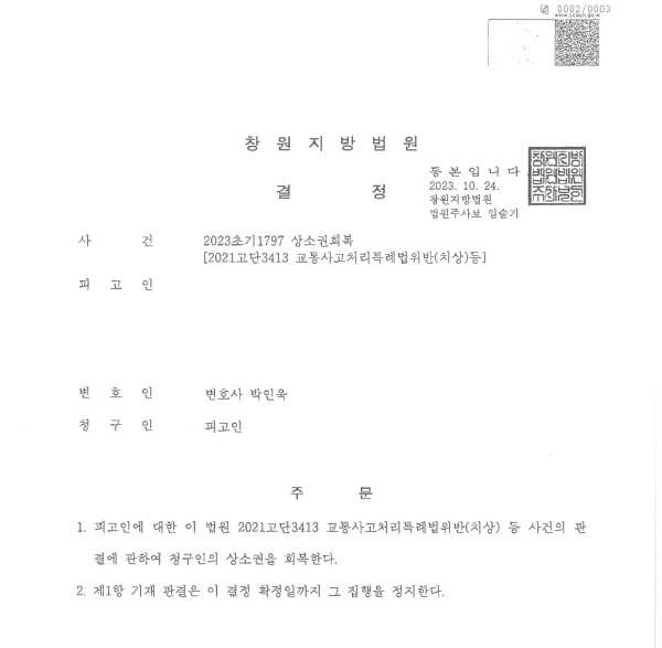 창원지방법원 2023초기1797 상소권회복(2021고단3413 교통사고처리특례법위반(치상)등)