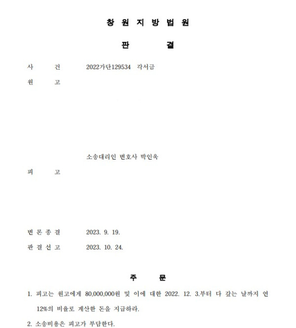창원지방법원 2022가단129534 각서금