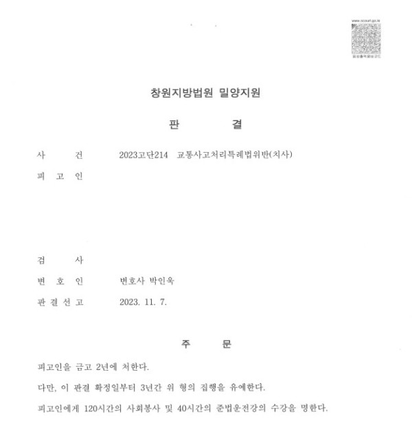 창원지방법원 밀양지원 2023고단214 교통사고처리특례법위반(치사)