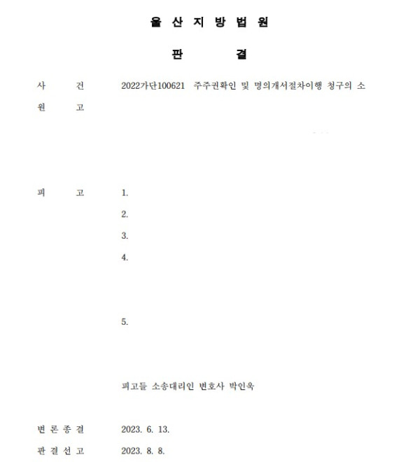 울산지방법원 2022가단100621 주주권확인 및 명의개서절차이행 청구의 소