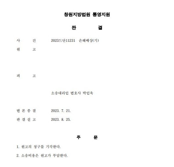 창원지방법원 통영지원 2023드단11231 손해배상(기)