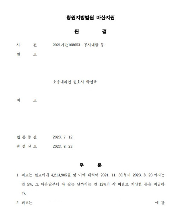 창원지방법원 마산지원 2021가단108653 공사대금 등