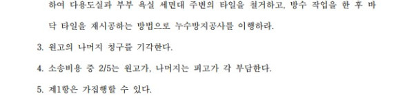 원고가 주장하는 배상범위에서 건물의 노후화 등을 고려하여 피고의 책임을 70%정도로만 제한하였지만 일부 배상액 인정, 그리고 대체적 작위의무인 누수방지공사를 이행하라는 부분도 인정이 되었습니다.