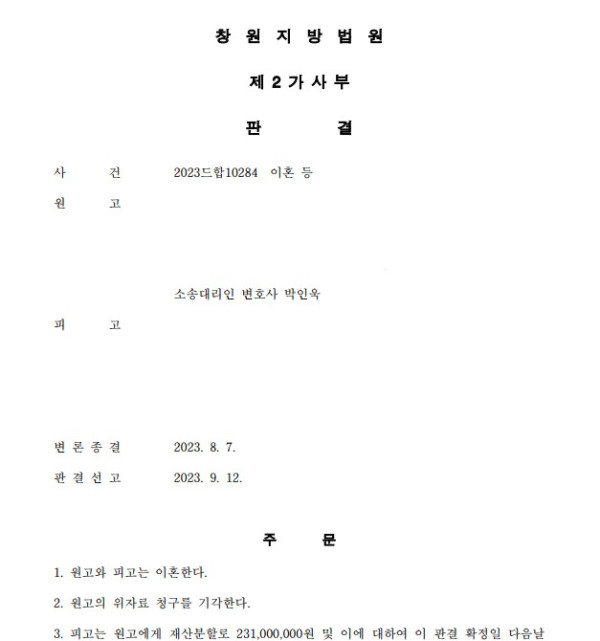 민법 제840조 제6호에 의한 이혼을 인정하고 위자료는 인정되지 않았고, 재산분할을 명하는 판결이 선고되었습니다.