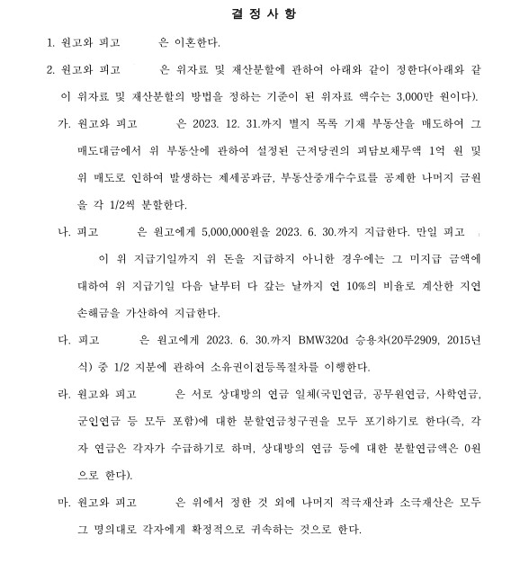 재판부는 ① 피고는 원고에게 위자료로 500만 원 지급, ② 재산분할과 관련해서는 부동산을 매도하여 그 매도대금에서 위 부동산에 관하여 설정된 근저당권의 피담보채무액 1억 원 및 위 매도로 인하여 발생하는 제세공과금, 부동산중개수수료를 공제한 나머지 금원을 각 1/2씩 분할, ③ 사건본인의 친권자 및 양육자로 원고를 지정, ④ 피고는 원고에게 사건본인의 양육비로 사건본인이 초등학교를 졸업할 때까지는 월 700,000원, 중학교에 입학한 달부터 중학교를 졸업하는 달까지는 월 900,000원, 고등학교에 입학한 달부터 성년에 이르기 전날까지 월 1,100,000원을 매월 말일에 지급하라는 내용의 조정을 갈음하는 결정을 하였고, 양측이 이의신청을 하지 않음에 따라 위 사건은 확정되었습니다.