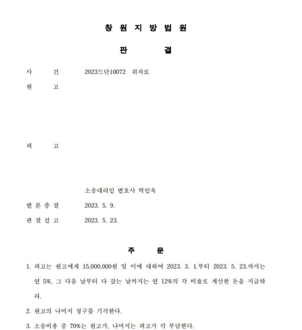 창원지방법원 2023드단10072 위자료