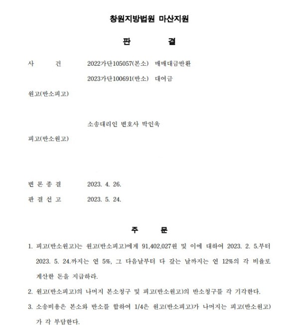 창원지방법원 마산지원2022가단105057 매매대금반환 본소, 2023가단100691 대여금 반소