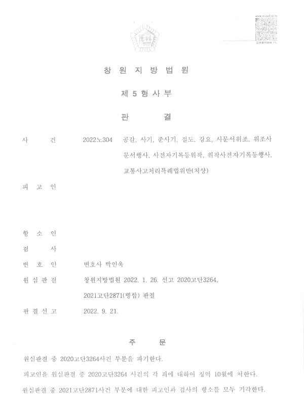 피고인은 1심에서 지적장애가 있는 피해자를 상대로 공갈, 사기, 준사기, 절도, 강요, 사문서위조, 위조사문서행사, 사전자기록등위작, 위작사전자기록등행사 등의 범죄를 저질렀다는 내용으로 기소되었고(병합사건도 있음) 전부 부인하며 다투었으나 2년의 실형을 선고받고 법정구속되었습니다.