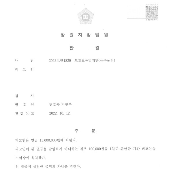 창원지방법원 2022고단1829 도로교통법위반(음주운전)