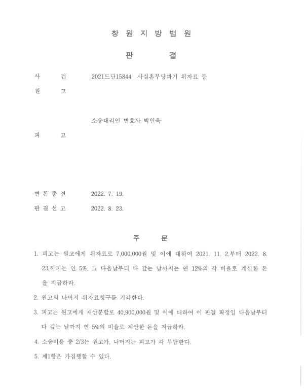 창원지방법원 2021드단15844 사실혼부당파기 위자료 등 (원고대리)