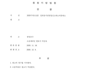 1.사안 창원지방법원 2020구단11122 일반음식점영업신고취소처분취소(피고 행정청 대리) 원고는 피고 담당공무원으로부터 일반음식점 영업신고를 수리한다는 …