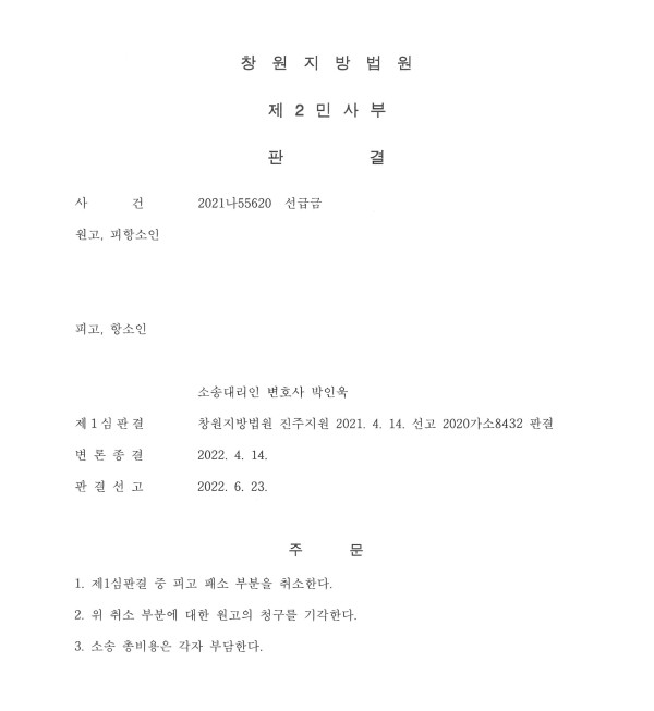 창원지방법원 2021나55620 선급금