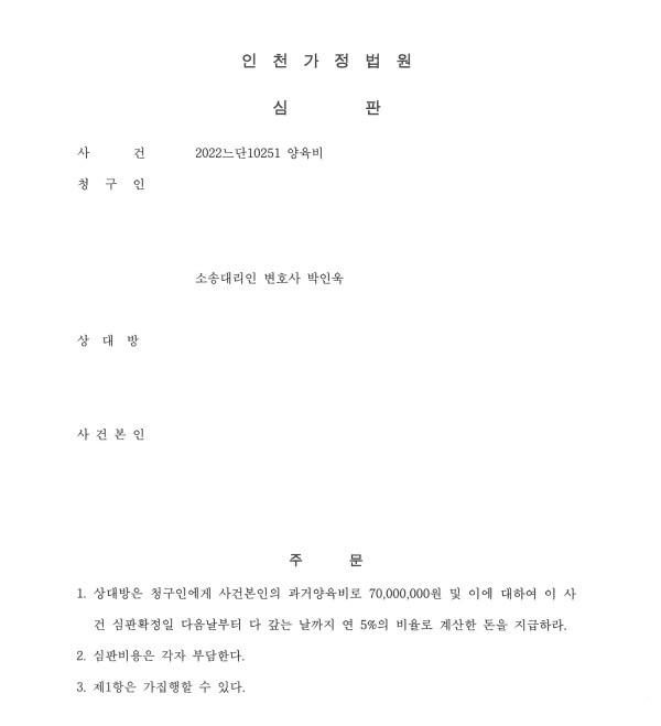 이에 청구인은 상대방을 상대로 과거양육비의 지급을 구하는 양육비심판청구를 제기하였습니다.