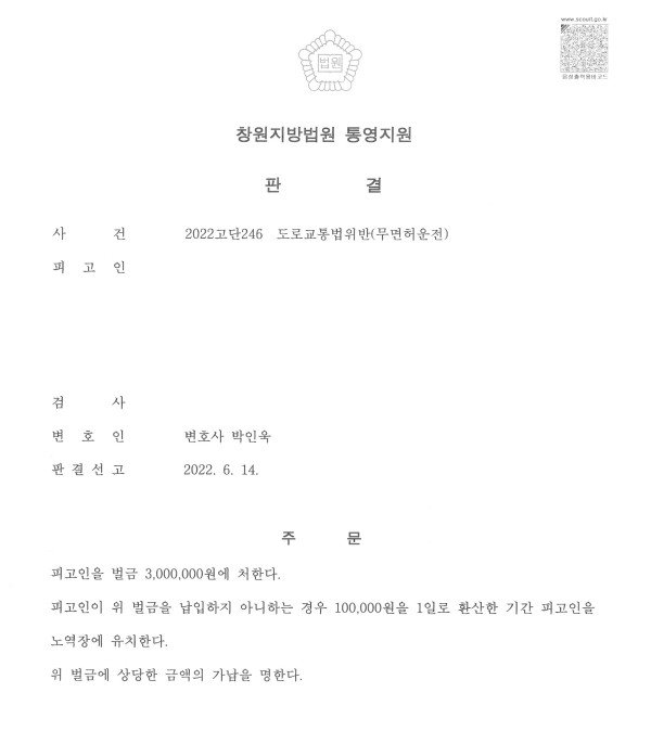 창원지방법원 통영지원 2022고단246도로교통법위반(무면허운전)