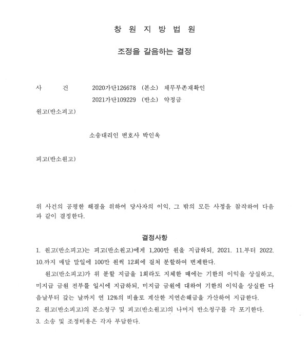 (창원지방법원 2020가단126678 채무부존재확인(본소), 2021가단109229 약정금(반소) 사건)