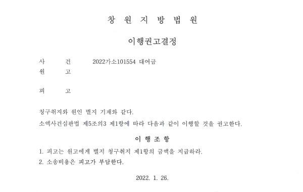 원고의 청구를 전부 인용하는 내용의 이행권고결정이 내려졌고 피고 역시 이의하지 않아 확정되었습니다. 현재는 집행 중입니다.