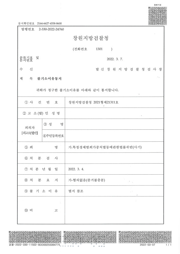 창원지방검찰청 2021형제21311호 특정경제범죄가중처벌등에관한법률위반(사기)