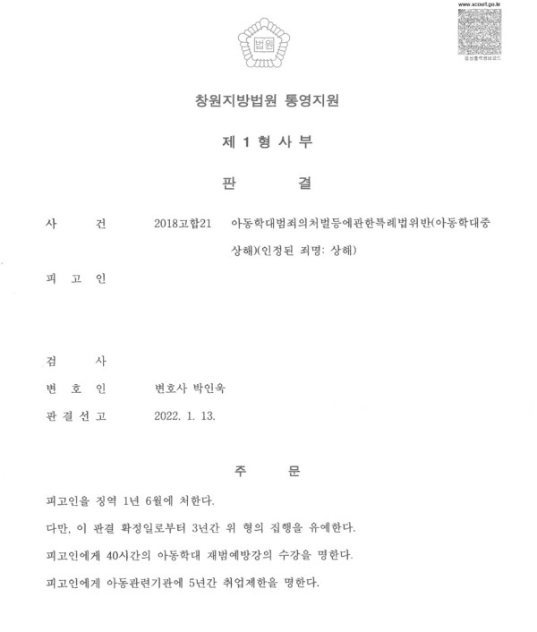 창원지방법원 통영지원2018고합21 아동학대범죄의처벌등에관한특례법위반(아동학대중상해)(인정된 죄명: 상해)