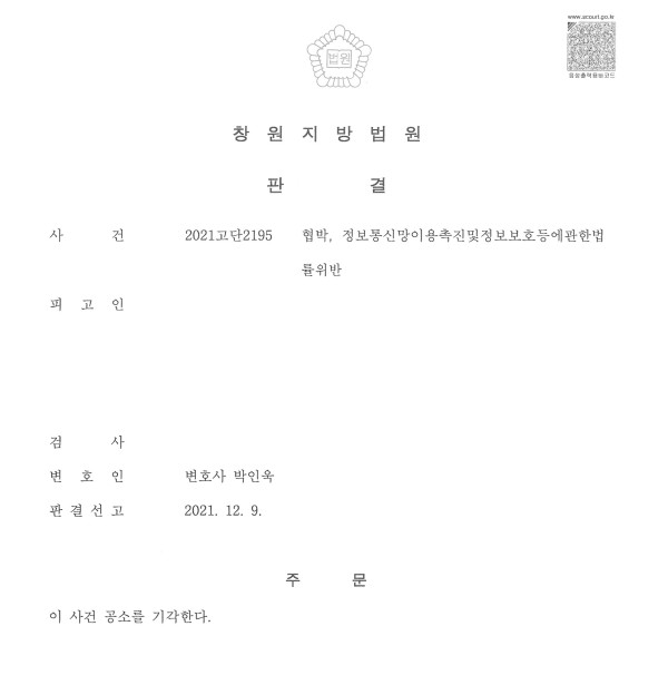 창원지방법원 2021고단2195 협박, 정보통신망이용촉진및정보보호등에관한법률위반