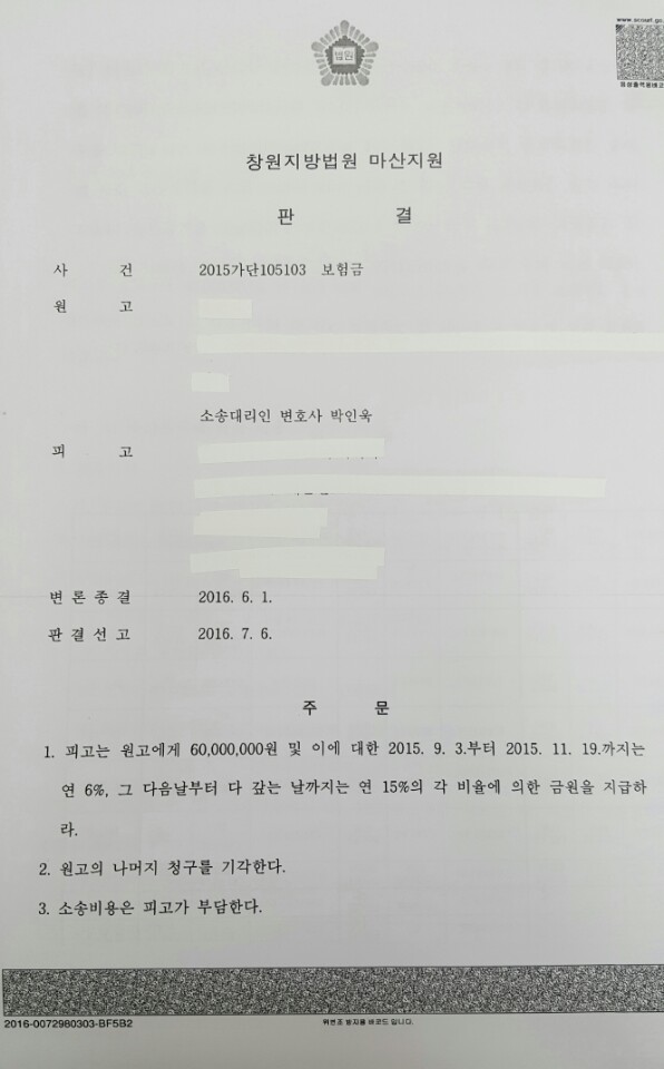결국 기나긴 인고의 시간을 거쳐 아래와 같이 원고 전부 승소 취지(원고는 2015. 8. 28.부터 지연이자의 지급을 구하였으나 보험금 청구일 다음날인 2015. 8. 29.과 8. 30.은 토, 일요일로서 영업일이 아니고 인보험금은 3영업일이 지난 때인 2015. 9. 3.부터 지연이자를 배상하게 됩니다)의 보험금 지급을 명하는 판결이 내려졌습니다.