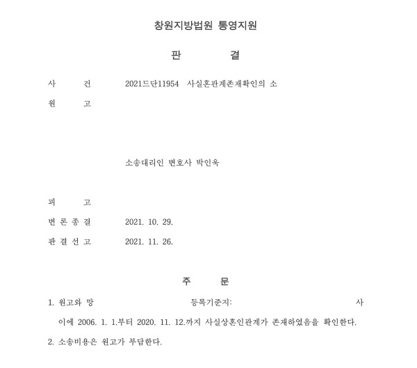 창원지방법원 통영지원 2021드단11954 사실혼관계존재확인의 소