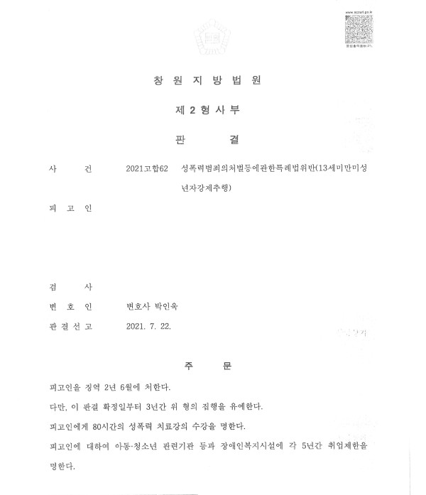 창원지방법원 2021고합62 성폭력범죄의처벌등에관한특례법위반(13세미만미성년자강제추행)
