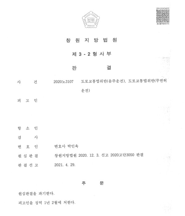 창원지방법원2020노3107 도로교통법위반(음주운전) 도로교통법위반(무면허운전)