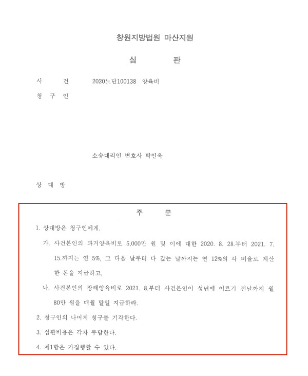 과거양육비 약 5,000만원과 장래 양육비 월 80만원 지급결정이 있었습니다.