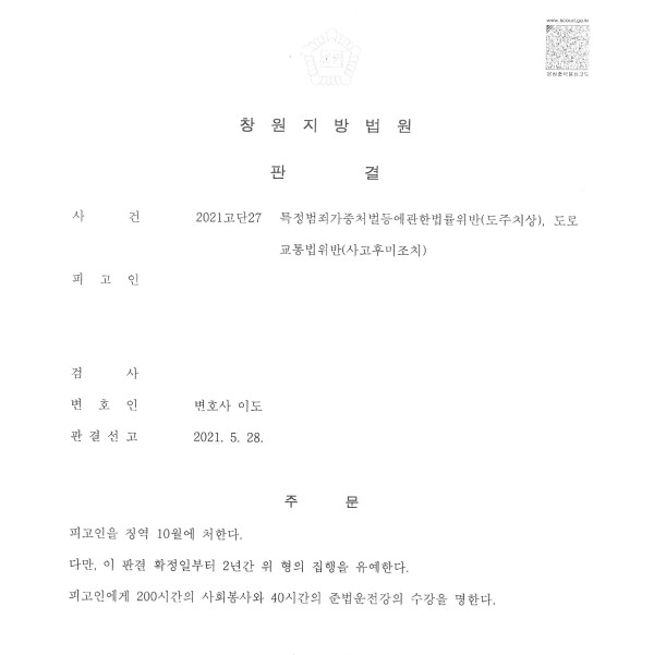 창원지방법원 2021고단27 특정범죄가중처벌등에관한법률위반(도주치상), 도로교통법위반(사고후미조치)