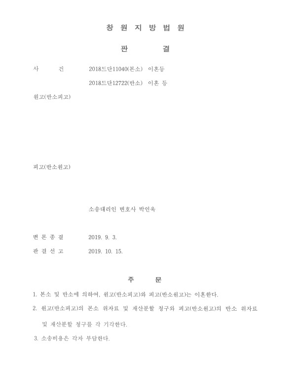 그 결과 원고가 주장하는 위자료 및 재산분할 전부가 기각되었습니다.