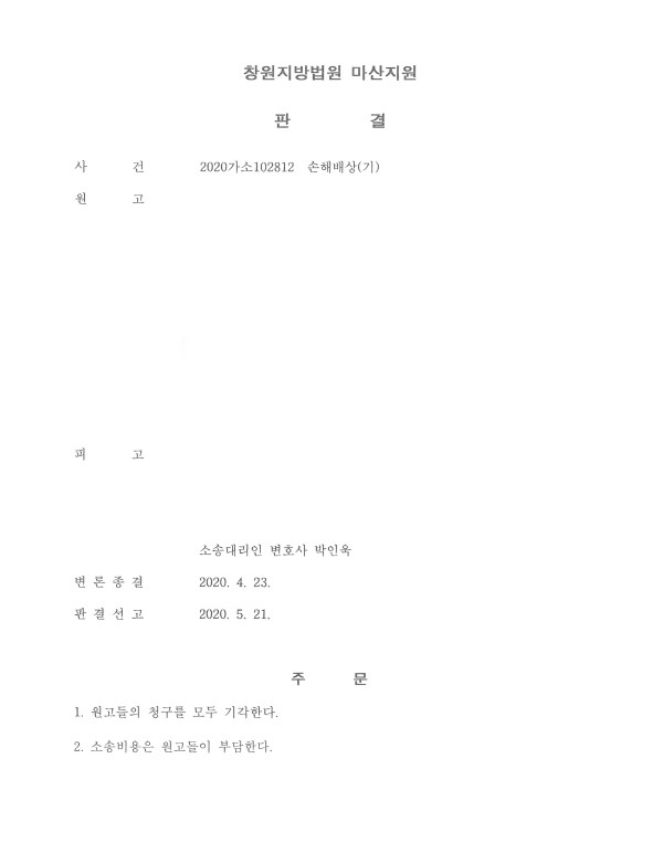 창원지방법원 마산지원 2020가소나102812 손해배상(기)