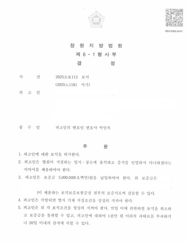 창원지방법원 2025초보113 보석(2025노1181 사기)
