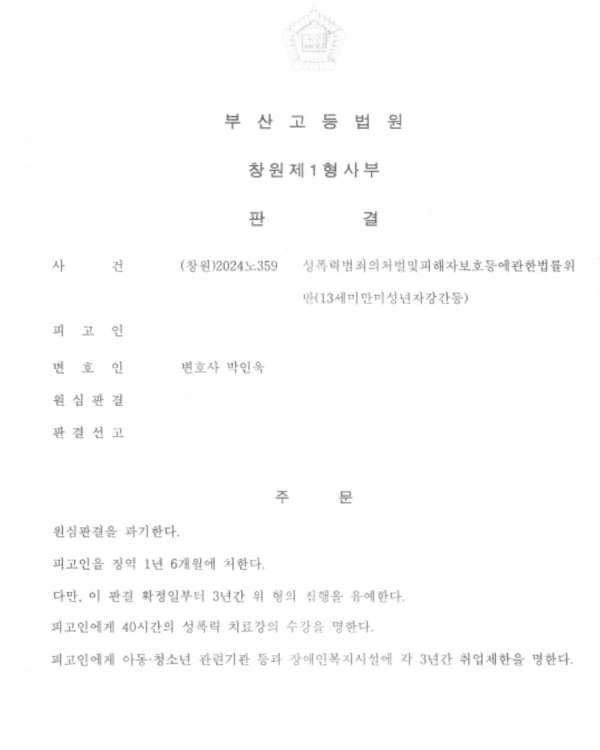 부산고등법원 창원재판부 2024노359 성폭법(13세미만미성년자강간등)