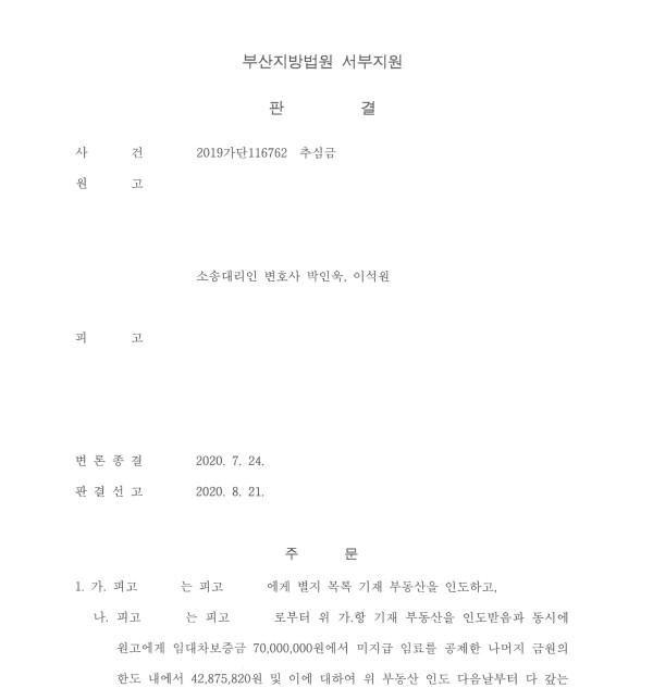 피고2를 상대로는 위 부동산을 인도받음과 동시에 원고에게 임대차보증금 7,000만원에서 미지급 임료를 공제한 나머지 금원의 한도 내에서 4,200만원 및 이에 대하여 위 부동산 인도 다음날부터 다 갚는 날까지 연5%의 비율로 계산한 금원을 지급하라.는 소를 제기