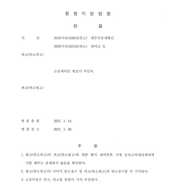 창원지방법원 2019가단102812(본소) 채무부존재확인 2020가단102191(반소)대여금 등