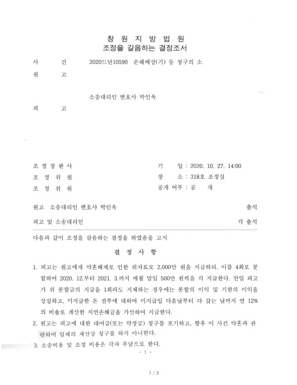 조정으로 원고는 피고로부터 금 2,000만원을 분할로 지급받기로 하는 내용의 조정이 성립되었습니다.