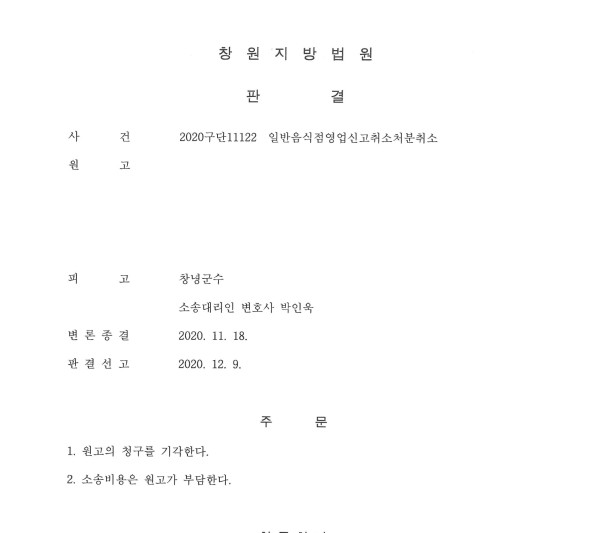창원지방법원 2020구단11122 일반음식점영업신고취소처분취소(피고 행정청 대리)