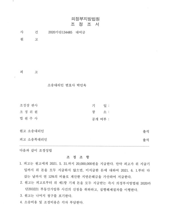 원고가 소로써 구한 5,000만원을 훨씬 하회하는 20,000,000원을 지급할 것을 내용으로 하는 조정이 성립되었습니다.