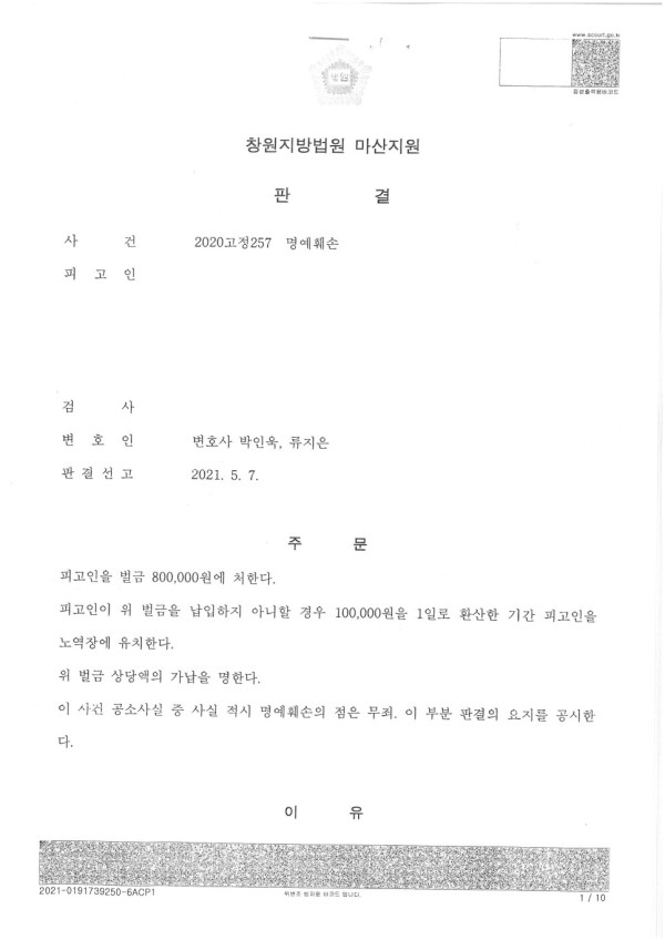 사실 명예훼손의 점은 무죄판결이 선고되었습니다.